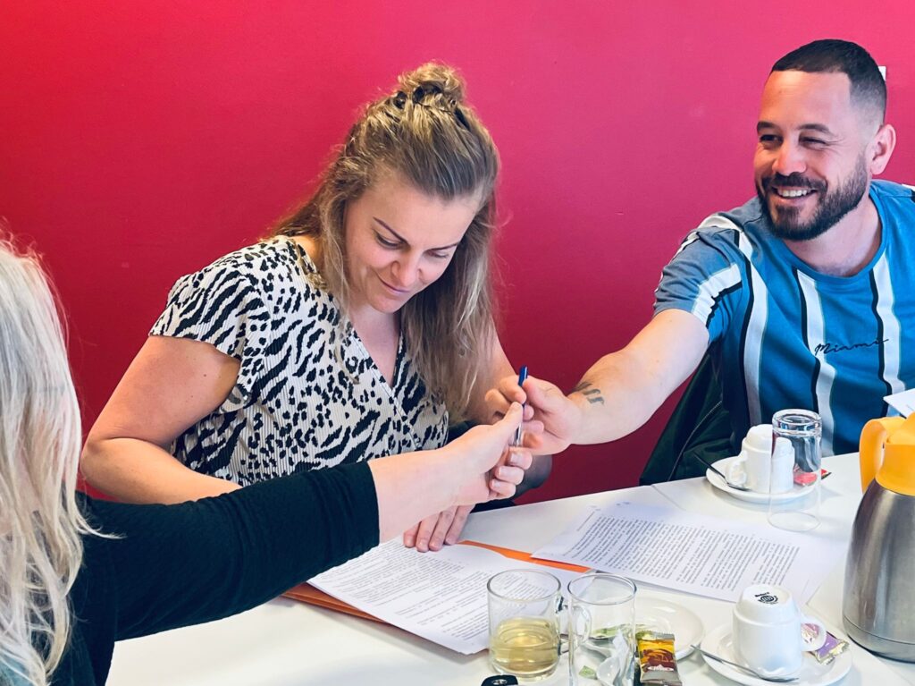 Ondertekening van de franchiseovereenkomst met Driestroom. Van links naar rechts Sandra de Graaf (directeur Driestroom Onderneemt), Lisette Tijs (Bestuurder Driestroom), Mime vd Weerden, Silvie Verberkt, Jason Cornelis en Lieda vd Vis (hoofdhandelaar)
